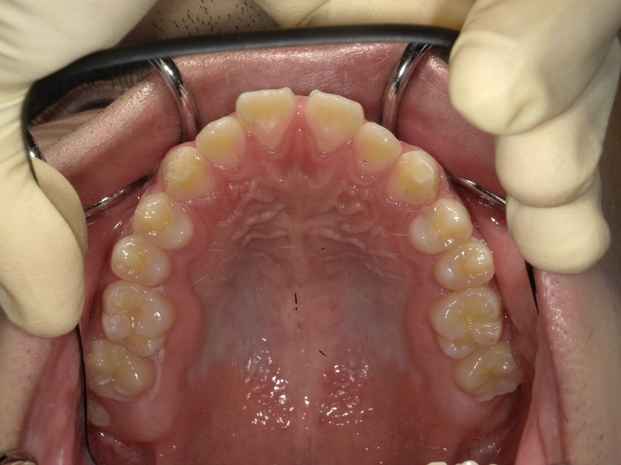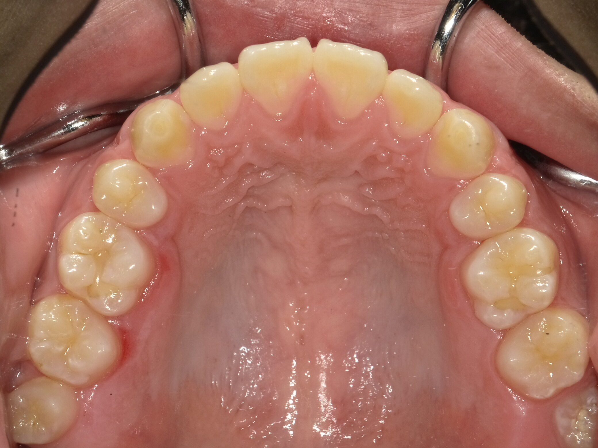 「上下顎前突」とは上下の前歯が前に出ている歯並びのことを表します。歯が並ぶスペースが足りなくて、歯が上下とも前に出てしまえば上下顎前突になります。歯のサイズに対して上下の顎が生まれつき小さい場合、サイズの不調和で上下顎前突になることがあります。ここでも口呼吸による舌の位置の悪さが関与していることがあるのですが、特に頬圧に押されることで歯並びの横幅が狭くなってしまいます(V字型の歯列)。