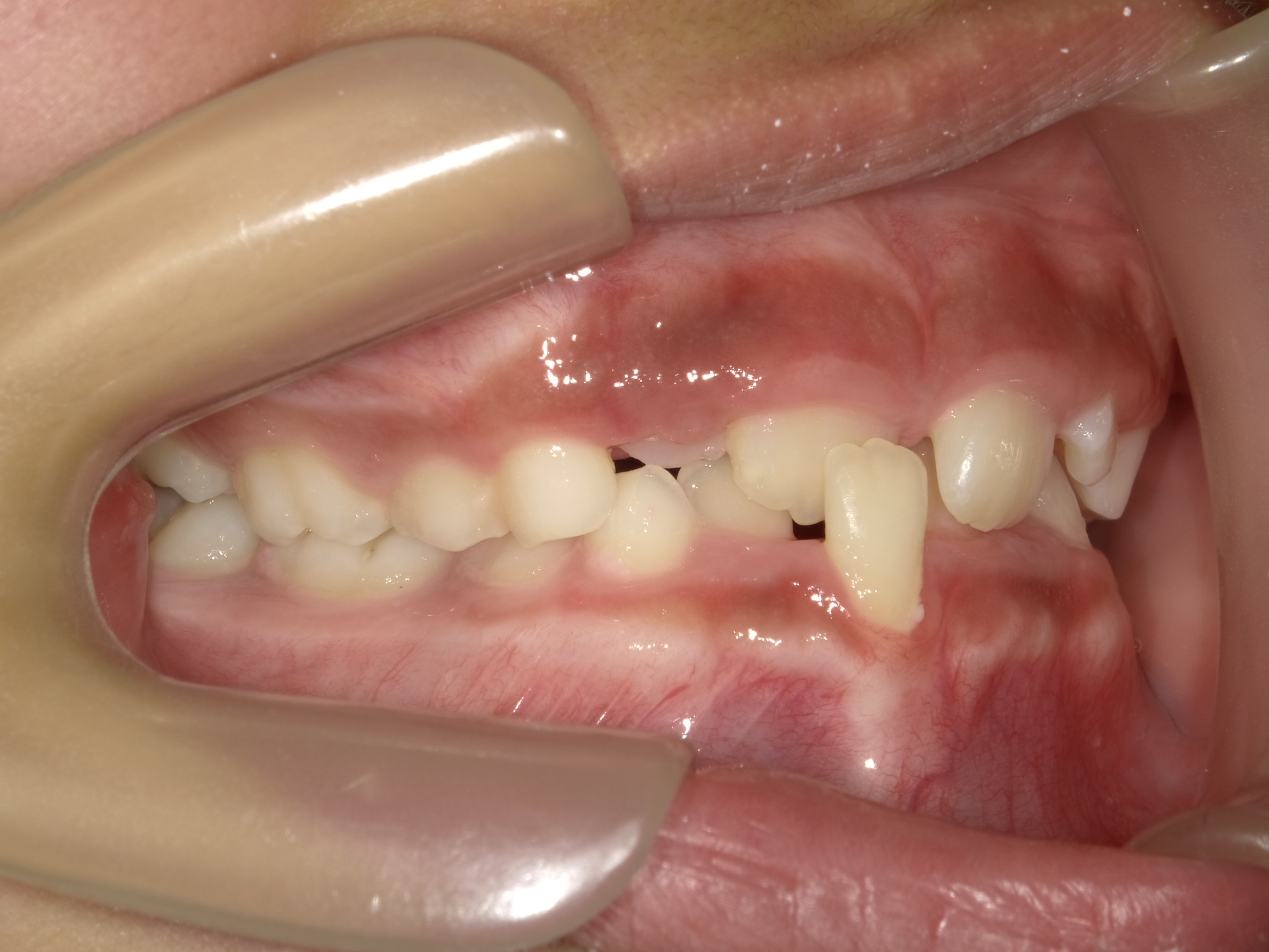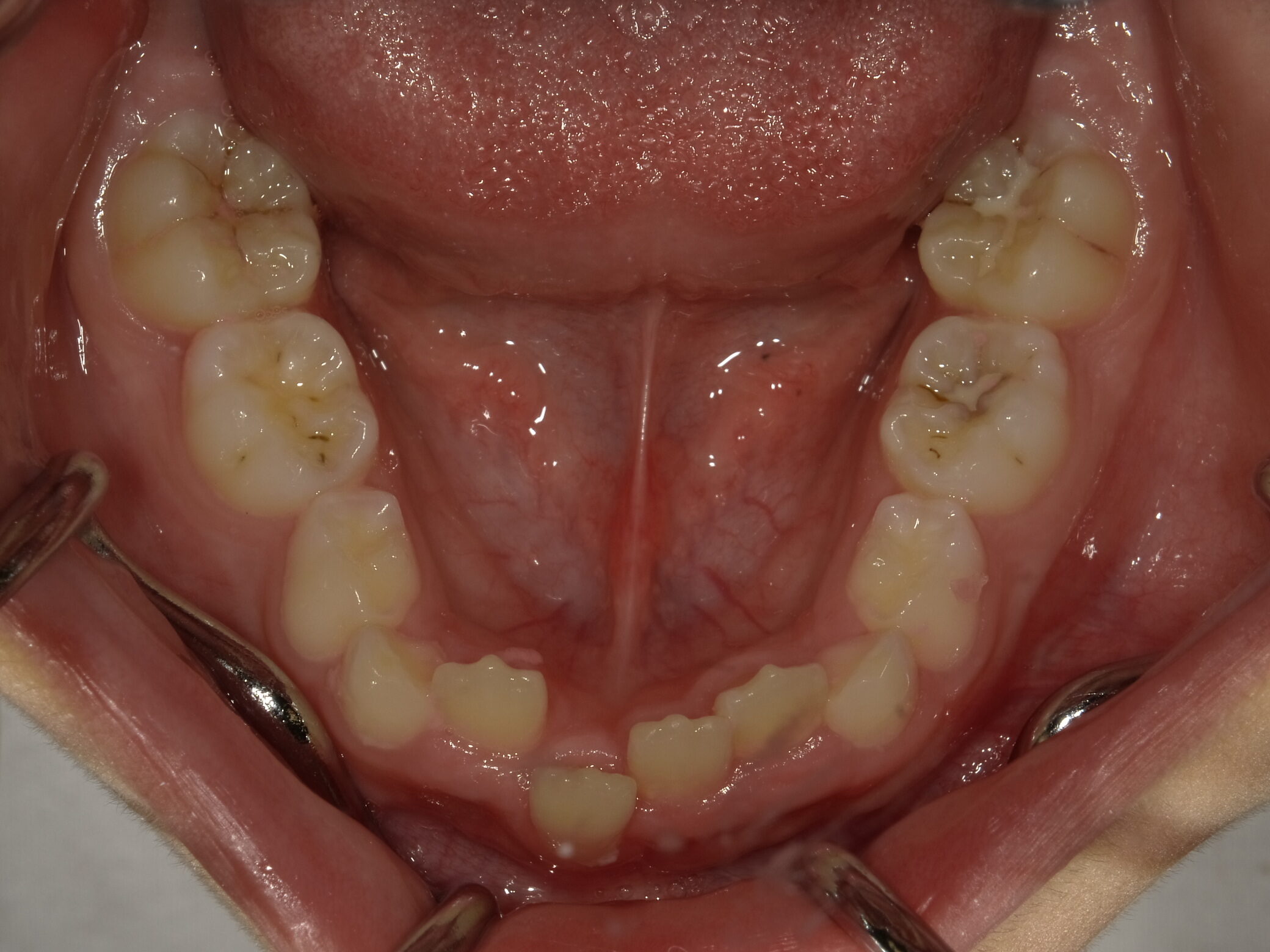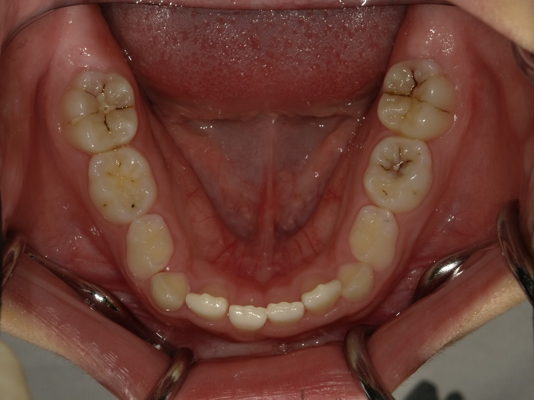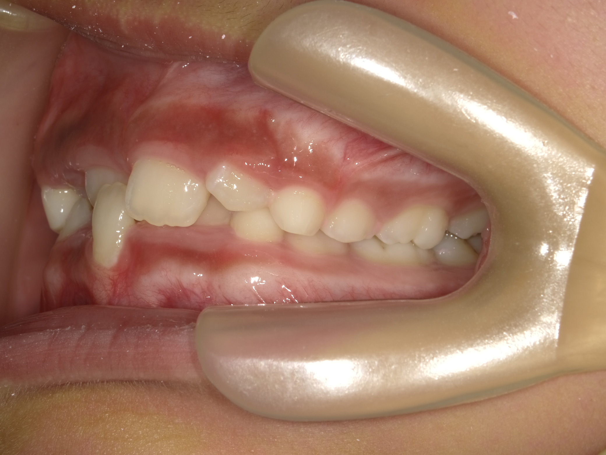前歯に交叉咬合が生じた場合、その部分は歯並びががたついているので「叢生」と捉えても良いのですが、この咬み合わせで厄介なのは交叉咬合の部分で咬み合わせが制限されて下顎の動きに制約が生じることです。食事のときなどに下顎を自由に動かすことができず、その後の顎の成長や顎の関節に悪影響を与えてしまいます。また、下の前歯が反対に咬んで出ている状態では、下の前歯に過度な力がかかって唇側の歯茎がぐんと下がってしまうこともあります(歯肉退縮)。