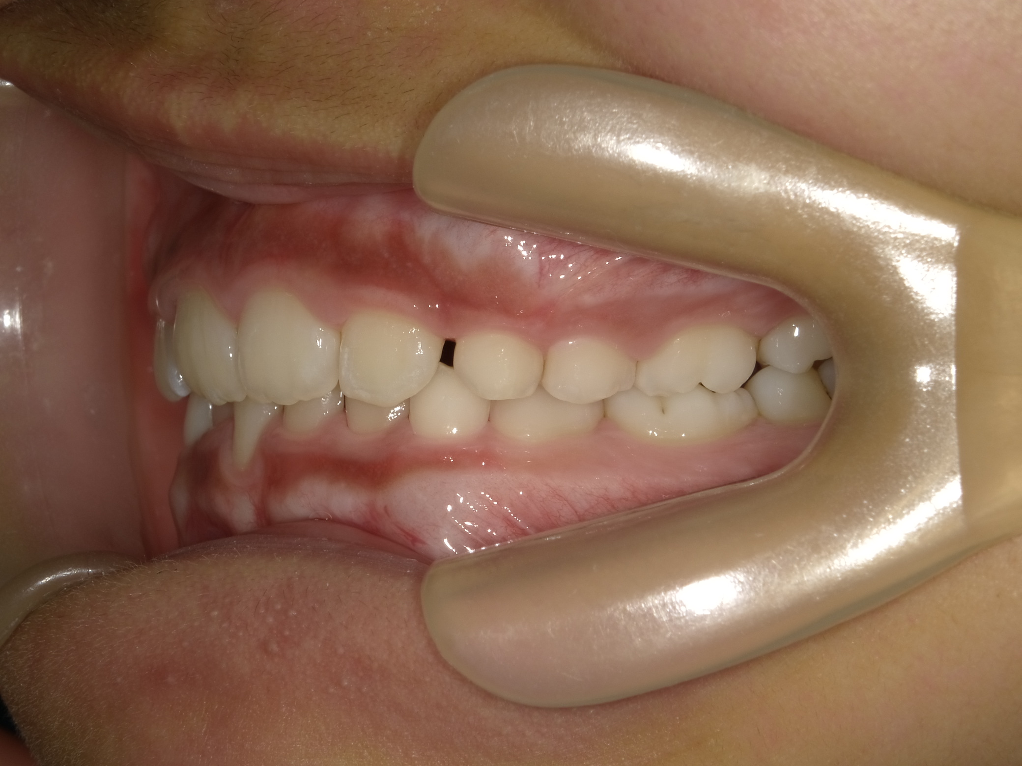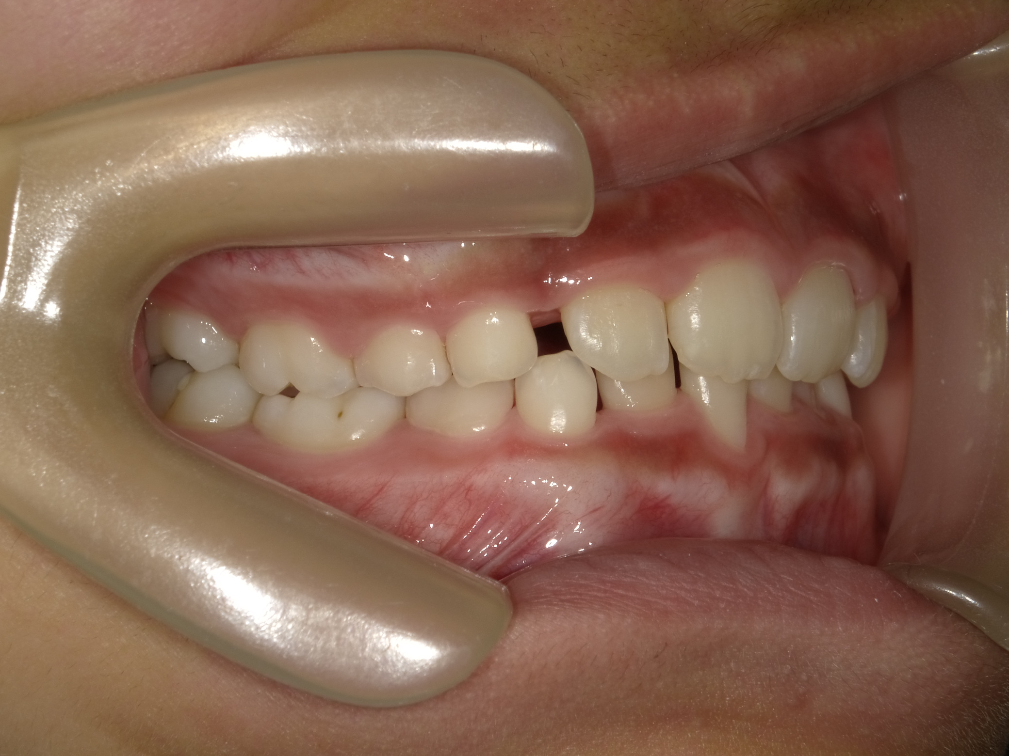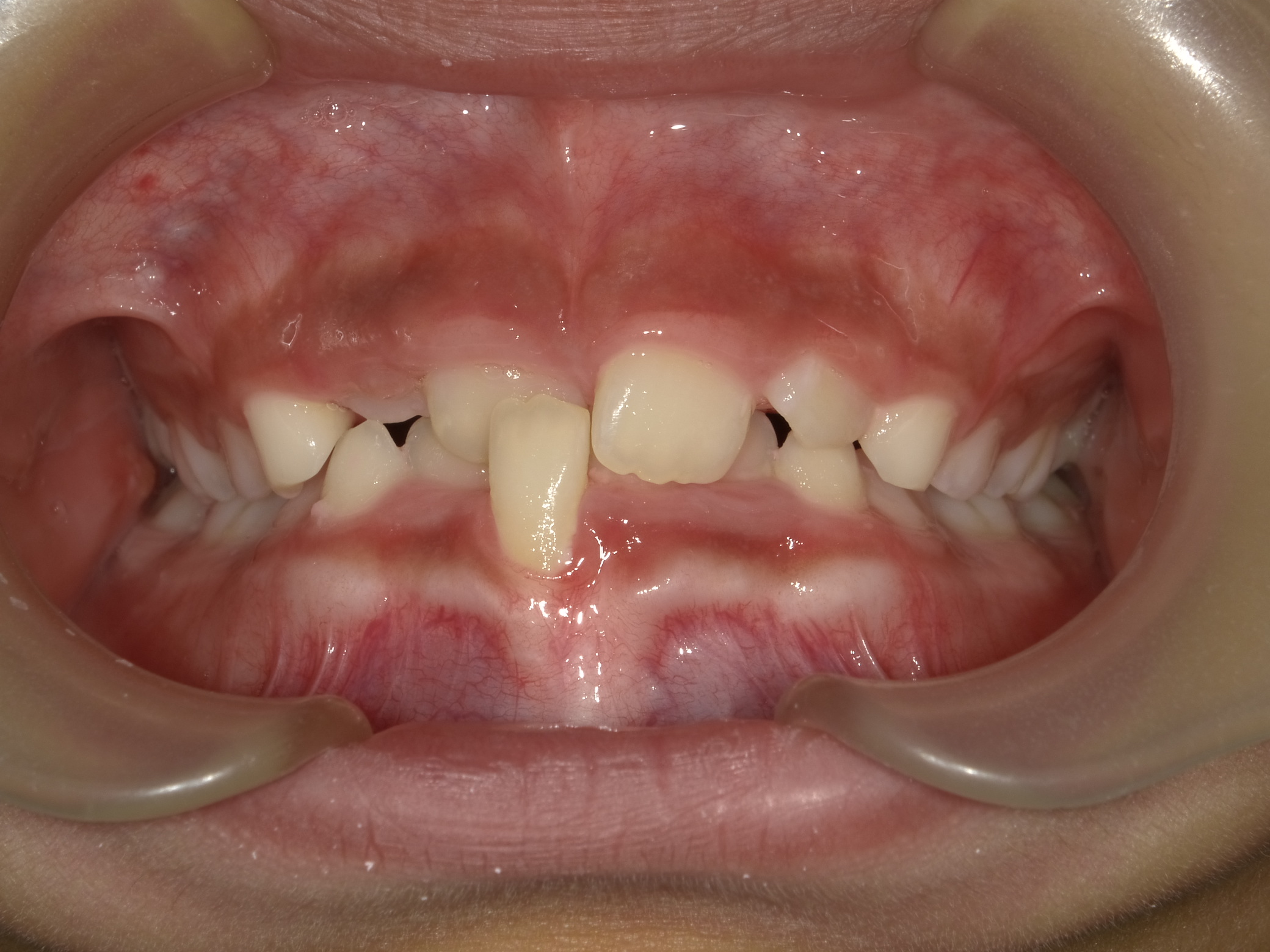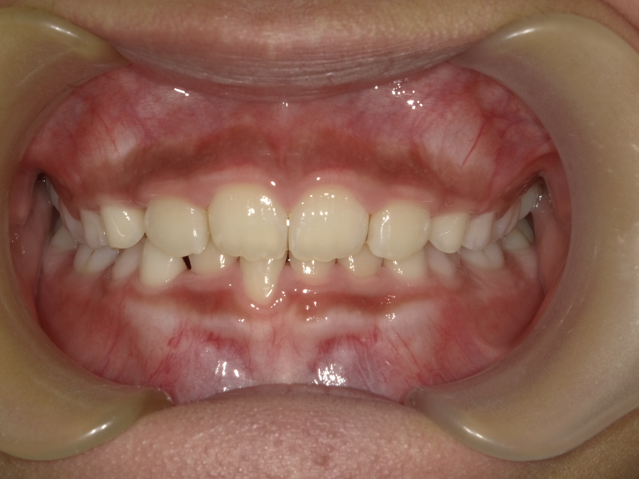 前歯に交叉咬合が生じた場合、その部分は歯並びががたついているので「叢生」と捉えても良いのですが、この咬み合わせで厄介なのは交叉咬合の部分で咬み合わせが制限されて下顎の動きに制約が生じることです。食事のときなどに下顎を自由に動かすことができず、その後の顎の成長や顎の関節に悪影響を与えてしまいます。また、下の前歯が反対に咬んで出ている状態では、下の前歯に過度な力がかかって唇側の歯茎がぐんと下がってしまうこともあります(歯肉退縮)。